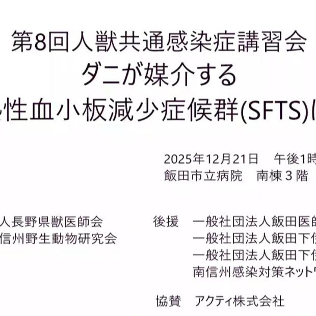 お知らせ 動物病院検索 イベント・セミナー 狂犬病予防 獣医師の仕事 野生動物救護・学校飼育動物 法人概要 アクセス 求人情報 会員専用ページ Since 1948 NaganoVeterinariansAssociation NaganoVeterinariansAssociation 伴侶動物、産業動物、公衆衛生等獣医師の知識・技能向上のための卒後共育や獣医師同士のネットワーク構築などを行い、獣医師の能力がより社会に役立つよう活動しています。 長野県獣医師会の活動 長野県獣医師会は、伴侶動物、産業動物、公衆衛生等に関わる獣医師により構成される団体です。 イベント・セミナーEvents & Seminars イベントとセミナー情報。オンラインレクチャーや学術集会についてはこちらです。 動物病院Animal Hospitals 長野県内の動物病院を検索できます。掲載を希望しない、または非会員の病院は表示されません。 各病院の詳細につきましては、病院に直接お問い合わせください。 狂犬病予防Rabies Prevention 日本に狂犬病を侵入させないため、犬の飼い主一人一人が狂犬病に関して正しい知識を持ち、飼い犬の登録と予防注射を確実に行うことが発生防止の基本です。 獣医師の仕事Veterinary Work 長野県獣医師会には、いろいろな分野で活躍する獣医師が所属しています。その一部をご紹介します。 野生動物救護 学校飼育動物Education Support 教育現場で適切な動物飼育のサポートを目的に、学校飼育動物担当教職員の皆様を対象とした研修会の開催や、相談窓口の設置等を行っております。 Topics お知らせを全て見る 大切なお知らせ 活動 伝染病 SFTS講習会の模様をご覧いただけます 大切なお知らせ もふもふプッシュにご用心(ペットによる事故防止) 活動 令和7年度「犬の行動学講座」及び「動物介在活動講座」の開催について 大切なお知らせ 伝染病 新型コロナウイルス感染症に関する情報について 伝染病 犬猫のマダニを予防しましょう 伝染病 台湾における狂犬病の発生について 活動 長野県との協定 イベント・セミナー イベント・セミナーを全て見る 開催形式 対面・オンライン共通開催 開催日時・終了日時 2026年02月12日(木) 10:30 ~ 2026年02月12日(木) 15:00 イベント・セミナー名 令和7年度肉用牛生産振興研修会 開催形式 オンライン 配信開始日時・配信終了日時 未定 イベント・セミナー名 【対象:獣医師】長野レクチャーシリーズ